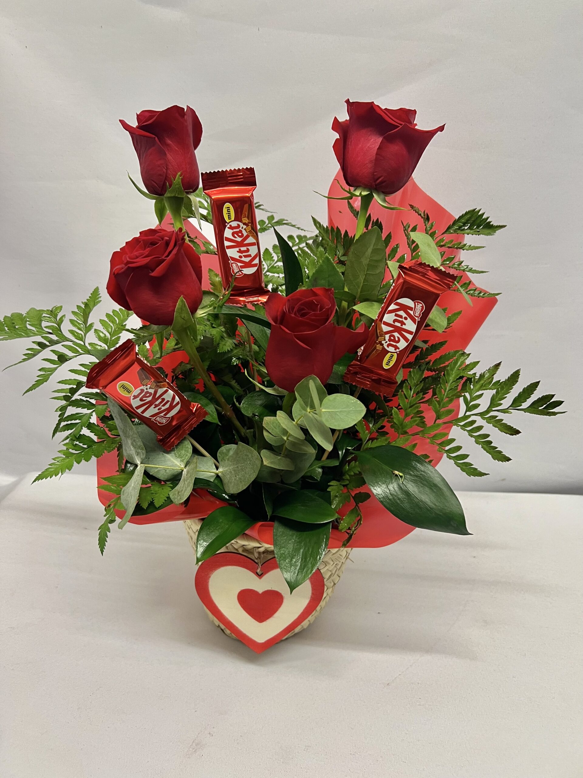 Cesta pequeña con 4 rosas, 3 kit-kat y un corazón