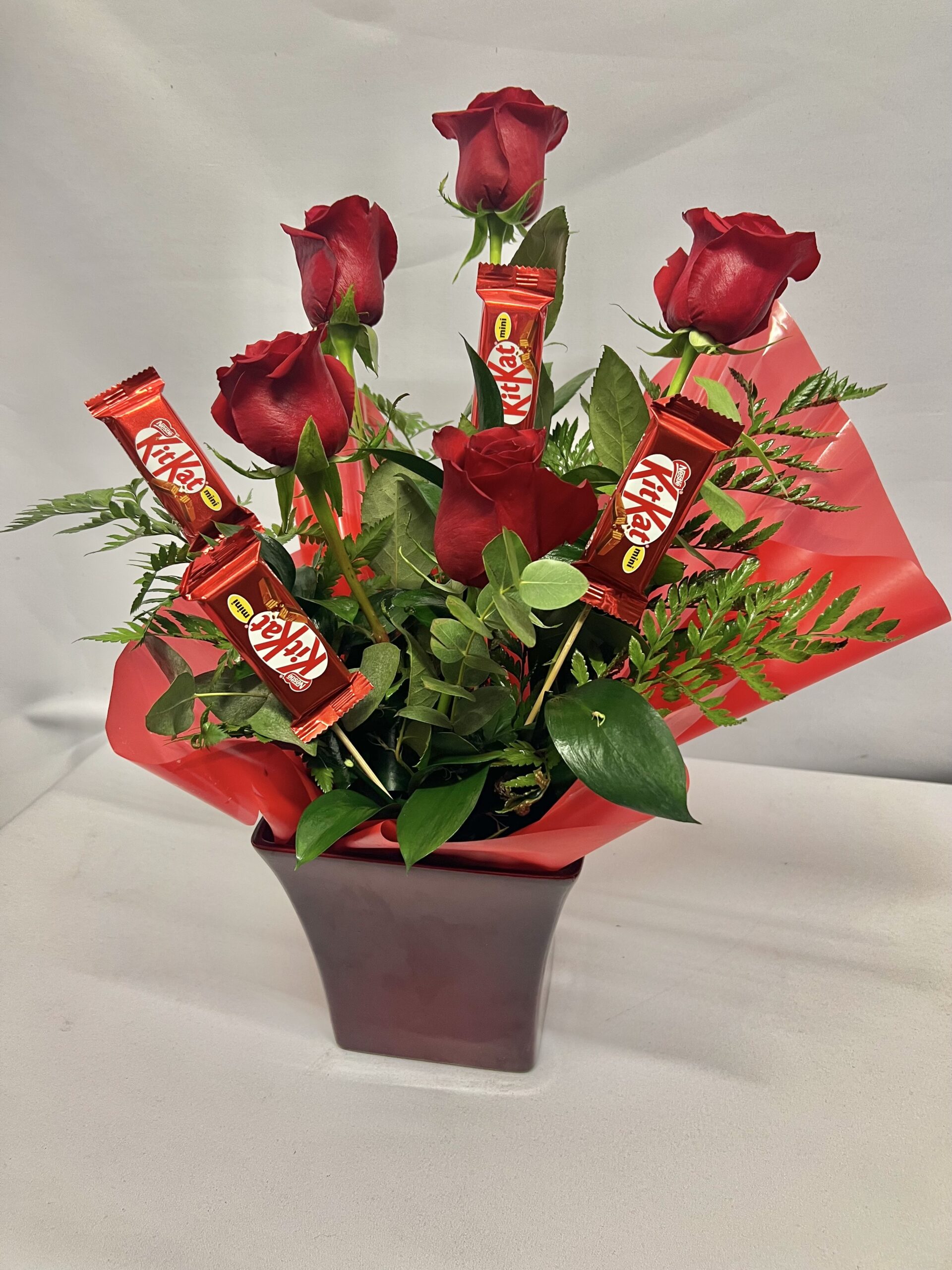 Macetero rojo con 5 rosas y 4 kit-kat